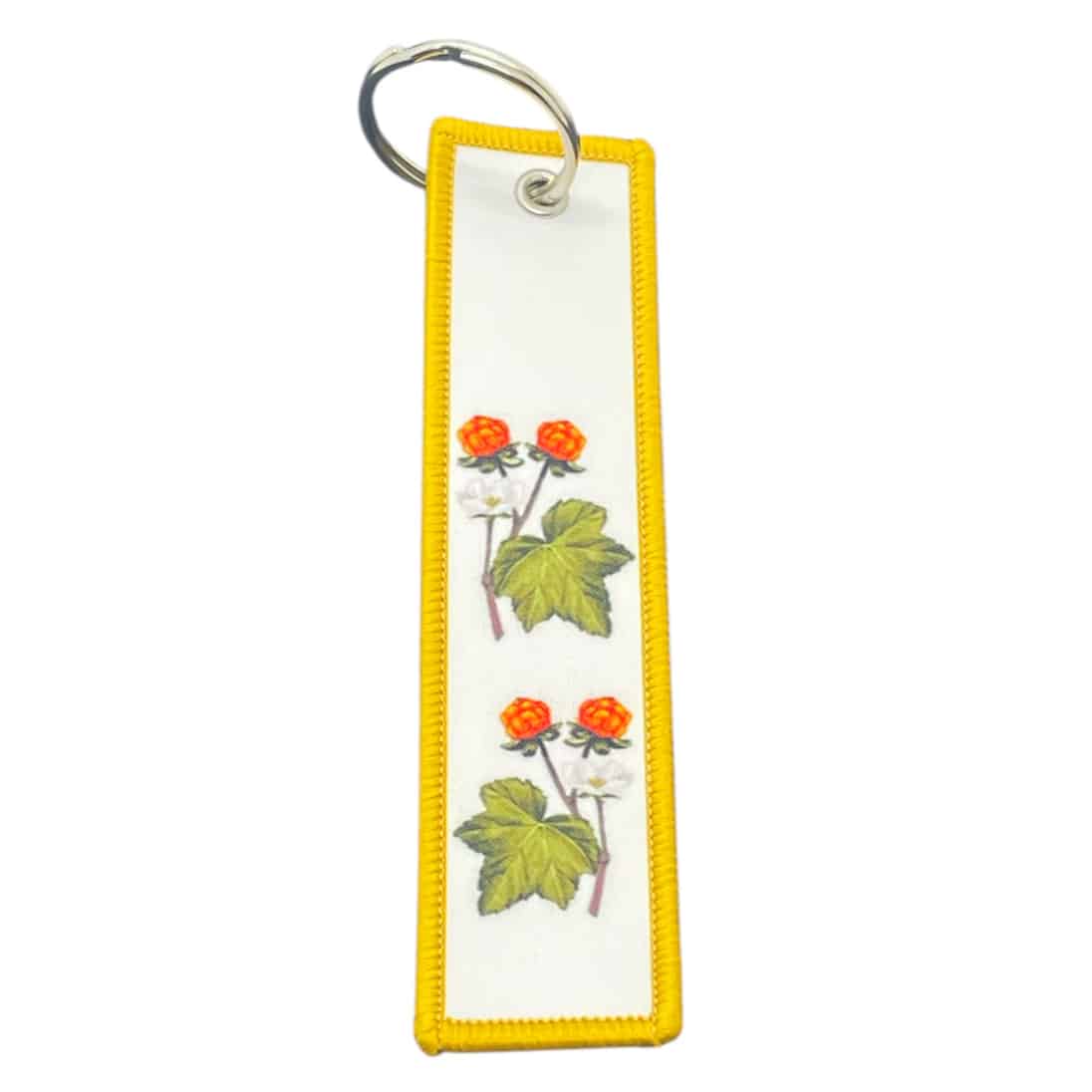 Tagg nyckelring – Hjortron är en slitstark och vacker accessoar inspirerad av norrländsk natur. En gyllene present för bärälskare och naturvänner.
